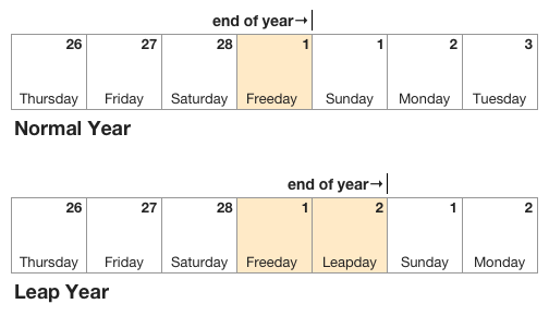 This leaves the year short by one day on regular years, two days on leap years. To fix this, we’ll add the extra days to a new fourteenth month at the end of the year, called “Non.” In normal years, Non has a single day called “Freeday.” In leap years, Freeday is followed by “Leapday.” These are holidays, so only people in the service industry have to work. (I kid, but please tip your servers.)